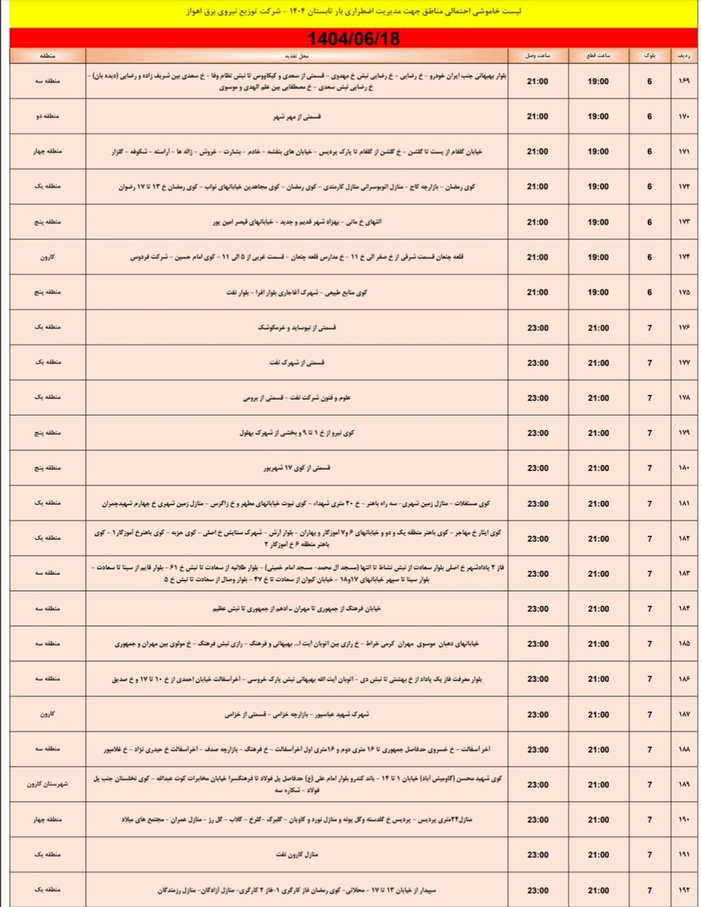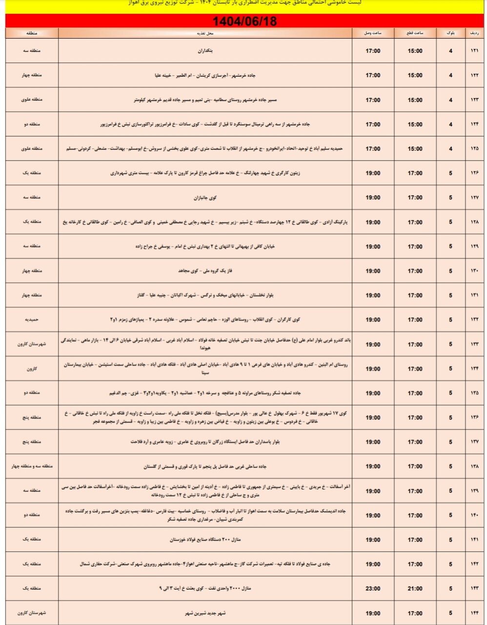 شرکت توزیع نیروی برق اهواز جدول خاموشی برق مناطق مختلف اهواز برای سهشنبه هجدهم شهریور رو اعلام کرد.