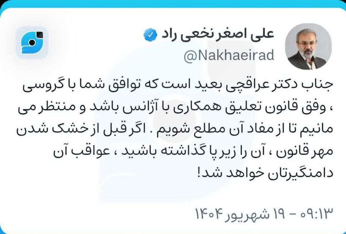 به گزارش  خبرآنلاین، در ادامه حملات نمایندگان تندروی مجلس به وزیر امور خارجه، علی اصغر نخعی راد، نماینده مشهد در فضای مجازی نوشت: جناب دکتر عراقچی بعید است که توافق شما با گروسی، وفق قانون تعلیق همکاری با آژانس باشد و منتظر می‌مانیم تا از مفاد آن مطلع شوی. اگر قبل از خشک شدن مهر قانون، آن را زیر پا گذاشته باشید، عواقب آن دامنگیرتان خواهد شد!