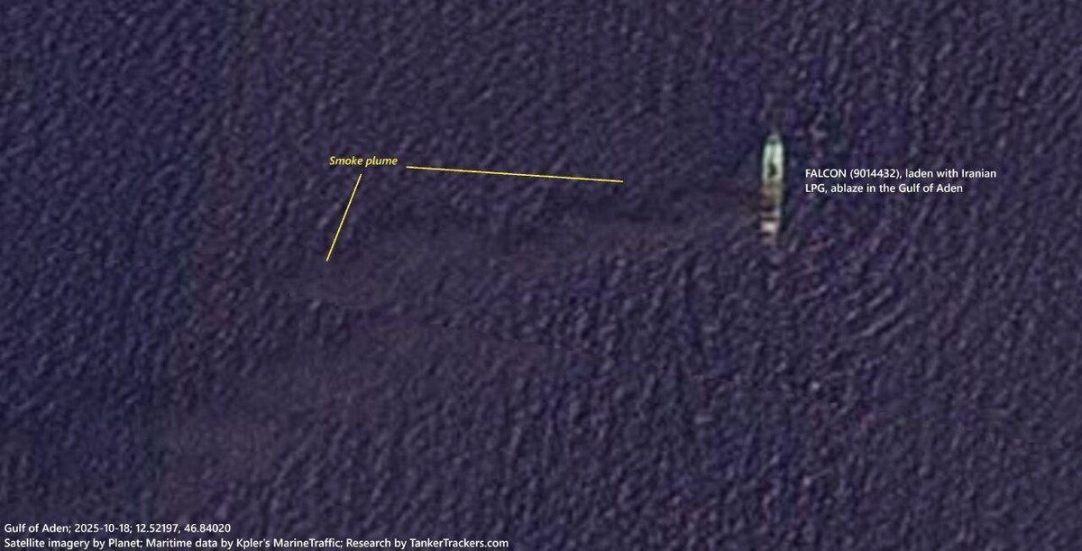 تصویر نشان میدهد که یک کشتی به نام FALCON که حامل گاز مایع پروپان ایرانی بوده، در خلیج عدن دچار آتشسوزی شده است.