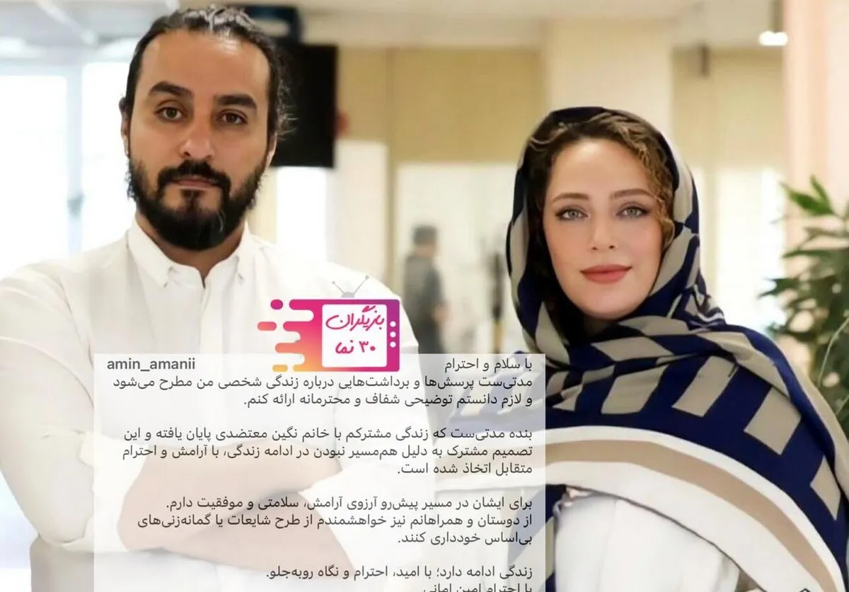 امین امانی، کارگردان و تهیهکننده سینما با انتشار پستی در اینستاگرم خبر جدایی خود از همسرش نگین معتضدی، بازیگر سینما و تلویزیون را اعلام کرد و نوشت این تصمیمی مشترک بوده که به دلیل هم مسیر نبودن در ادامه زندگی و با حفظ آرامش و احترام متقابل اتخاذ شده است.