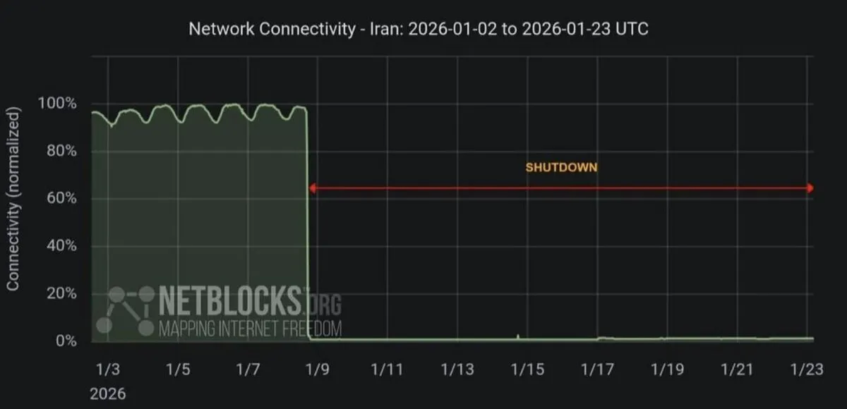 این طولانی‌ترین دوره قطعی اینترنت در سال‌های اخیر محسوب می‌شود که وارد سومین هفته خود شده است. نمودار خطی این سازمان نشان می‌دهد که از تاریخ ۳ ژانویه تا ۹ ژانویه، شبکه در وضعیت نرمال قرار داشته، اما از اواسط ژانویه با یک «سقوط آزاد"» وارد فاز SHUTDOWN شده است.