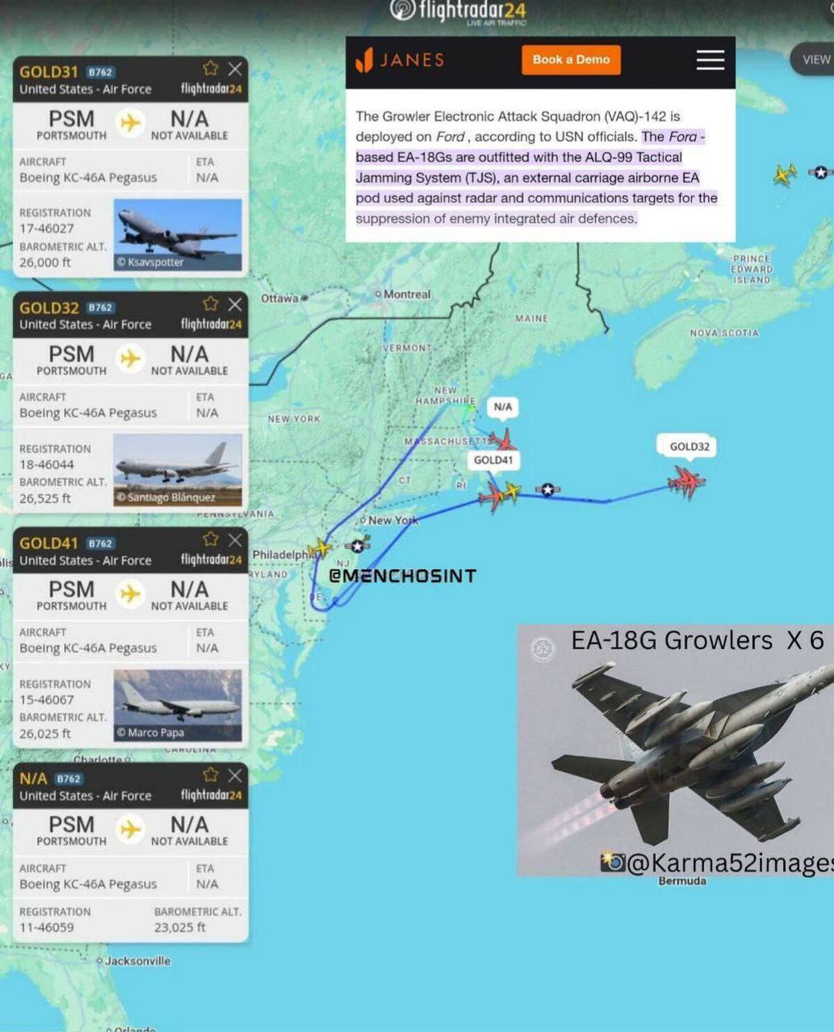 ۴ فروند هواپیمای جنگ الکترونیک ارتش آمریکا به سمت خاورمیانه در حال پرواز هستند.