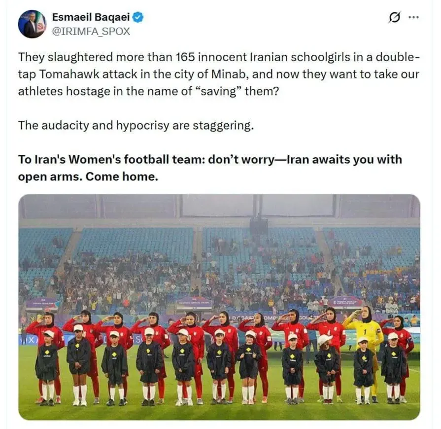اسماعیل بقائی سخنگوی وزارت امور خارجه به اخبار مربوط به پناهندگی اعضای تیم ملی فوتبال زنان واکنش نشان داد و نوشت: آنها ۱۷۰ دختر معصوم دبستانی ما را در یک حمله دو مرحله‌ای با موشک تاماهاک در شهر میناب کشتند و حالا به دنبال گروگان گرفتن بانوان ورزشکار ما به اسم «نجات آنها» هستند.