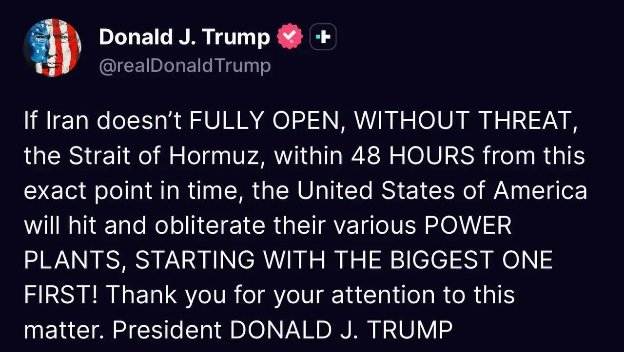 ترامپ با طرح یک تهدید تازه، در تروث سوشال نوشت: «اگر ایران ظرف ۴۸ ساعت از همین لحظه تنگه هرمز را بهطور کامل و بدون تهدید باز نکند، ایالات متحده آمریکا به نیروگاههای مختلف آنها حمله کرده و آنها را از بین خواهد برد، و ابتدا از بزرگترین آنها شروع خواهد کرد!»