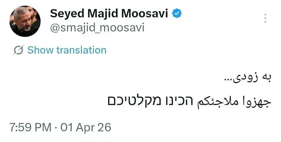 حساب توییتری فرمانده هوافضا سپاه دقایقی قبل با انتشا توییتی به زبان فارسی فقط نوشته شده است "به زودی... " و به زبان عبری به ساکنان سرزمین‌های اشغالی اعلام کرده است "پناهگاهتان را آماده کنید".