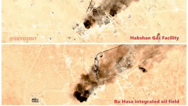 تصاویر ماهوارهای منتشرشده از آتشسوزی گسترده در میادین نفتی و گازی حبشان (Habshan)، عصب (Asab) و بوحصا (Bu Hasa) و همچنین خط لوله حبشان به فجیره (Fujairah) در امارات متحده عربی پس از حملات موشکی و پهپادی ایران آتشسوزی گسترده را نشان میدهد.