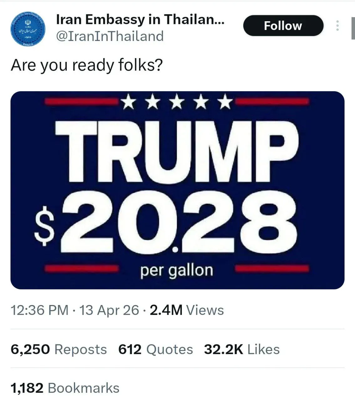 در توییتی که سفارت ایران در تایلند خطاب به امریکا منتشر کرده و حدود ۳ میلیون بازدید داشته، پرسیده شده: برای قیمت ۲۰ دلار برای هر گالن بنزین آماده‌اید؟