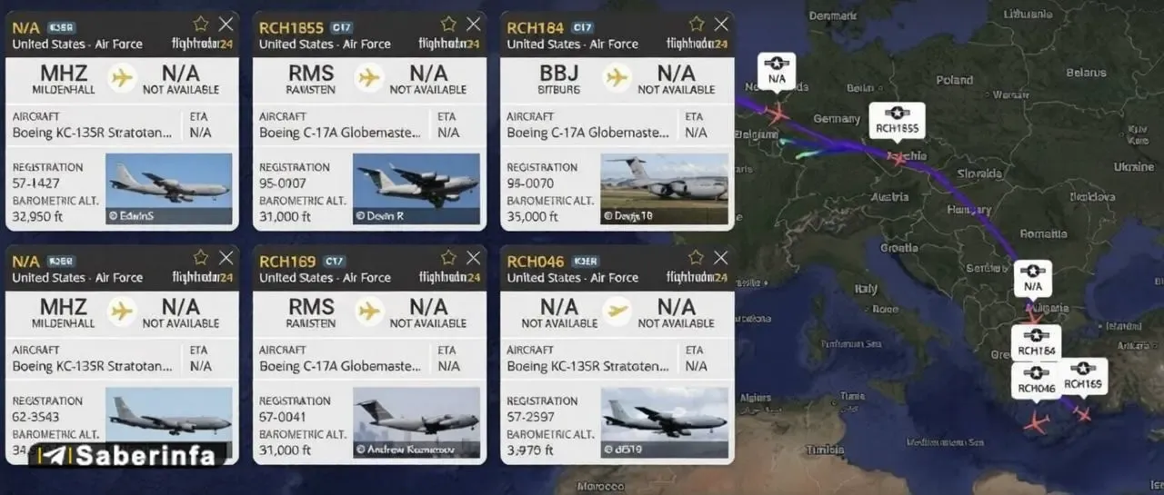 گزارش‌ها حاکی از حرکت ده‌ها فروند هواپیمای باری و سوخت‌رسانی نظامی آمریکا به سمت خاورمیانه است.