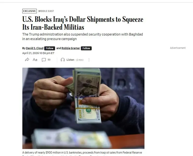 به گفته مقامات عراقی و آمریکایی که وال استریت ژورنال به آنها استناد کرده است، ایالات متحده ارسال دلارهای نفتی به عراق را متوقف کرده و برخی از برنامههای همکاری امنیتی با ارتش عراق را متوقف کرده است و فشار بر بغداد را برای مهار گروههای قدرتمند همسو با ایران افزایش داده است.