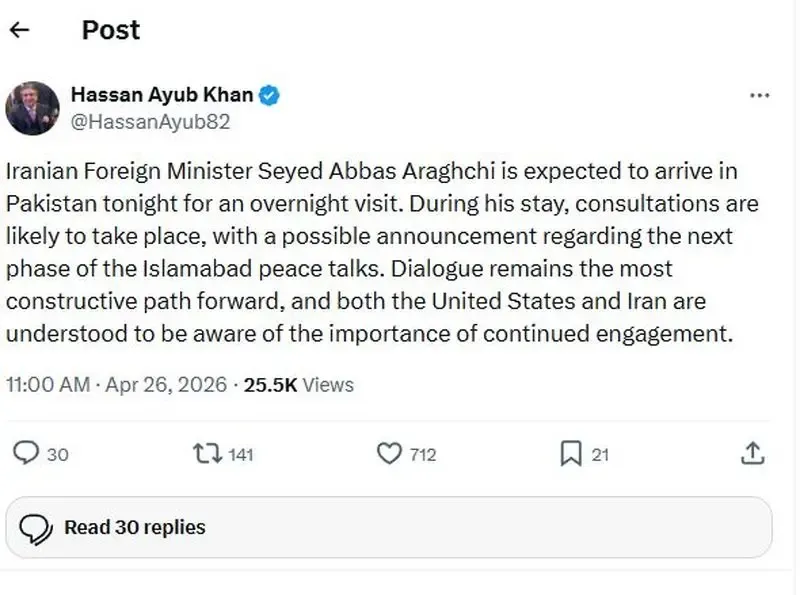 حسن ایوب خان، خبرنگار «آری نیوز» پاکستان، در شبکه اجتماعی ایکس نوشت: انتظار می‌رود سید عباس عراقچی، وزیر امور خارجه ایران، امشب برای یک سفر یک روزه وارد پاکستان شود. در طول اقامت او، احتمالاً رایزنی‌هایی انجام خواهد شد و احتمالاً در مورد مرحله بعدی مذاکرات صلح اسلام آباد اعلامیه‌ای صادر خواهد شد. گفت‌و‌گو همچنان سازنده‌ترین مسیر پیش رو است و هم ایالات متحده و هم ایران از اهمیت تعامل مداوم آگاه هستند.