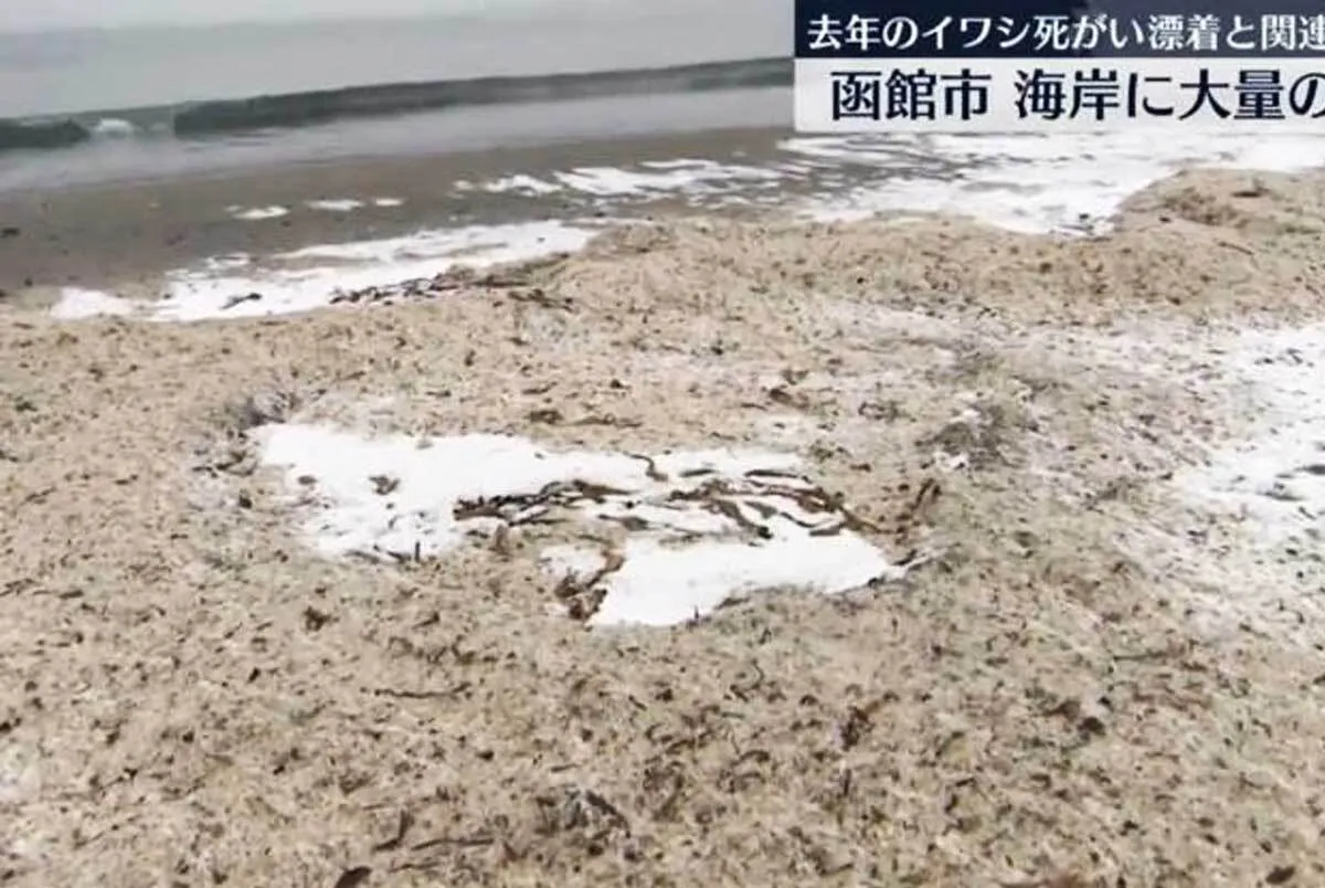 تلویزیون ژاپن اخیراً یک ساحل ۴۰۰ متری در هاکوداته را به نمایش گذاشت که از دور با پوششی از برف پوشیده شده بود. اما با بزرگنمایی دوربین، مشخص شد که این برف نیست و چیزی کاملاً متفاوت و وحشتناکتر است؛ لایهای ضخیم از استخوانهای سفید ماهی. کارشناسان میگویند که استخوانها به سختی از ساحل جدا میشوند، چراکه با ماسههایی که دائماً در خشکی در حرکتند، مخلوط میشوند.