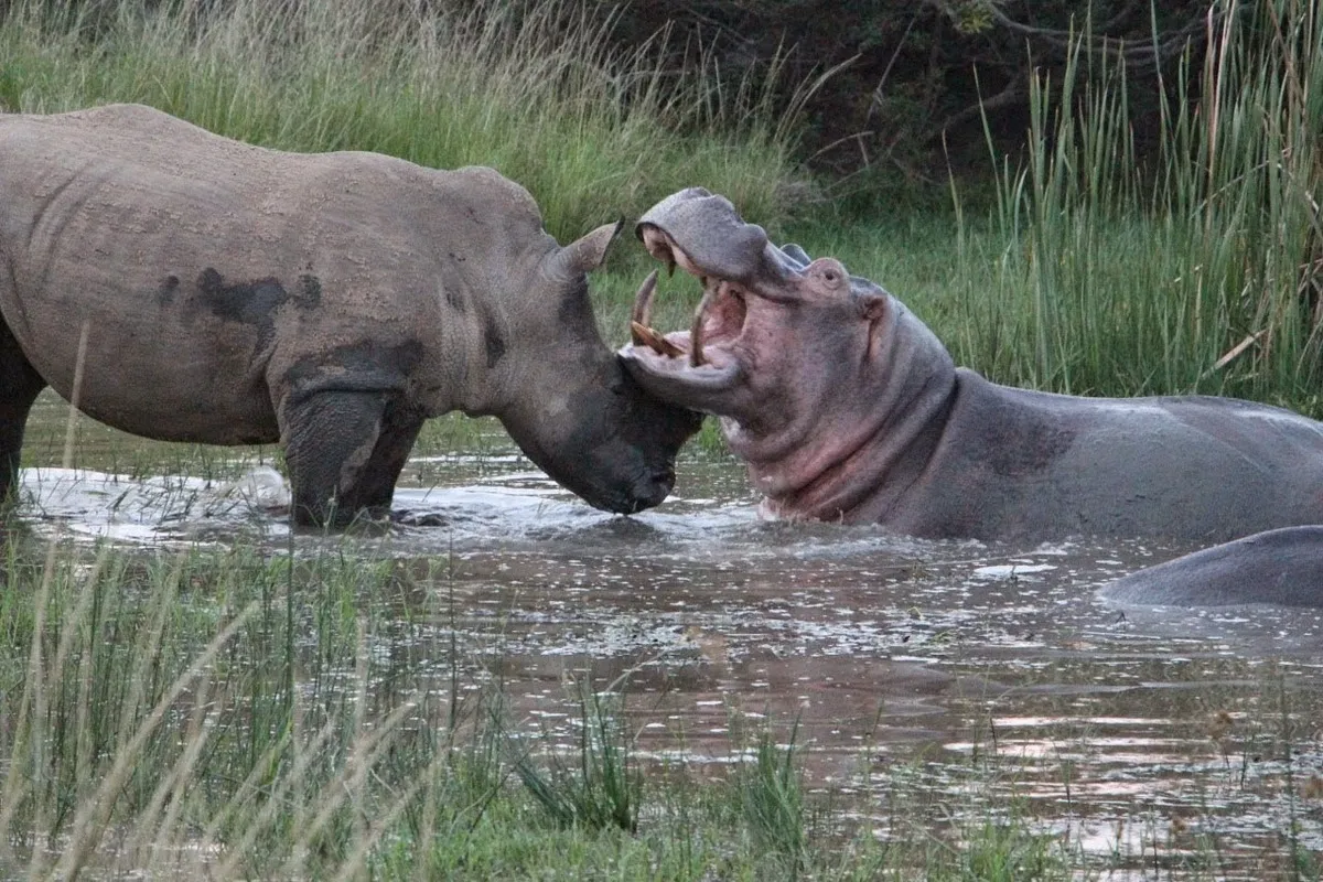 فیلم زیر تصاویری از دوئل جانانه یک اسب آبی با یک کرگدن بر سر حد و حدود قلمرو را نشان می‌دهد.