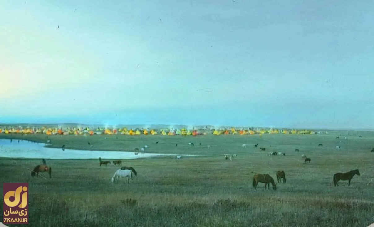اردوگاه قبیله‌ای سیاه‌پا با اسب‌های چراگاه. مونتانا اوایل دهه ۱۹۰۰. رنگی‌شده با سرسره فانوس شیشه‌ای توسط والتر مک کلینتاک.